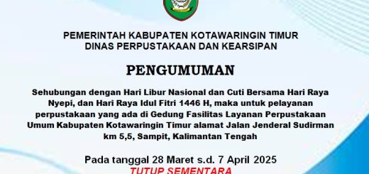 Sehubungan dengan Hari Libur Nasional memperingati Wafat Yesus Kristus, maka untuk pelayanan perpustakaan yang ada di Gedung Fasilitas Layanan Perpustakaan Umum Kabupaten Kotawaringin Timur Alamat Jalan Jenderal Sudirman km 5,5, Sampit, Kalimantan Tengah pada tanggal: