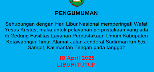 Sehubungan dengan Hari Libur Nasional dan Cuti Bersama Hari Raya Nyepi, dan Hari Raya Idul Fitri 1446 H, maka untuk pelayanan perpustakaan yang ada di Gedung Fasilitas Layanan Perpustakaan Umum Kabupaten Kotawaringin Timur alamat Jalan Jenderal Sudirman km 5,5, Sampit, Kalimantan Tengah